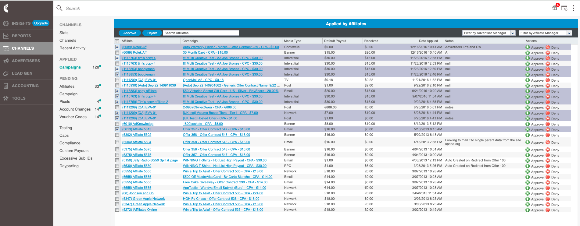 For clients who want to display all their offers in the affiliate portal but still control which affiliates are approved to run each offer, they can use the offer status of "apply to run." When an affiliates then applies for the offer through their portal, a pending campaign will be created and displayed in the Applied Campaigns queue for further approval.