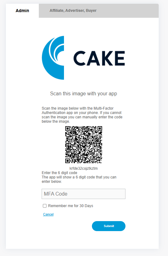 Multi-Factor Authentication (MFA) is a security system that verifies a user’s identity by requiring multiple credentials. In CAKE, the first form is the username and password, and the second form is the unique code generated by an application on the user's mobile device. MFA is only for employees of the CAKE network not for partners like Affiliate, Advertisers, or Buyers.